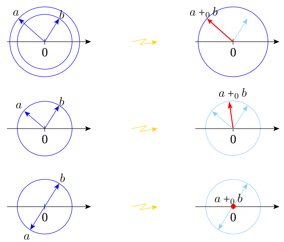 In formulas: if \(a=re^{\Ga i}\), \(b=re^{\Gb i}\) with \(|\Gb -\Ga |<\pi \), then \(a\cplus b=\{re^{\Gf i} \mid |\Ga -\Gf |+|\Gf -\Gb |=|\Ga -\Gb |\}\).