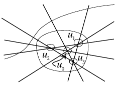 We say that a real singular point $\xi=(\xi_{0}:\xi_{1}:\xi_{2})$ of the curve $A$ is an intersection point of two real transversal branches, or, more briefly, a crossing,22Sometimes other names are used. For example: a node, a point of type $A_{1}$ with two real branches, a nonisolated nondegenerate double point. if the polynomial $a$ defining the curve has matrix of second partial derivatives at the point $(\xi_{0},\xi_{1},\xi_{2})$ with both a positive and a negative eigenvalue, or, equivalently, if the point $\xi$ is a nondegenerate critical point of index 1 of the functions $\{x\in\mathbb{R}P^{2}|x_{i}\neq 0\}\to\mathbb{R}\>x\mapsto a(x)/x_{i}\deg a$ for $i$ with $\xi_{i}\neq 0$. By Morse lemma (see, e.g. Mil-69) in a neighborhood of such a point the curve looks like a union of two real lines. Conversely, if $\mathbb{R}A_{1},\ldots,\mathbb{R}A_{k}$ are nonsingular mutually transverse curves no three of which pass through the same point, then all of the singular points of the union $\mathbb{R}A_{1}\cup\cdots\cup\mathbb{R}A_{k}$ (this is precisely the pairwise intersection points) are crossings.