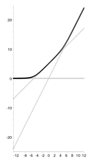 See the left plot in Figure 1, where the graph of $v=\ln(1+e^{u})$ is shown together with lines $v=0$ and $v=u$, which represent on the log paper the monomials 1 and $x$ involved in our polynomial $1+x$. The graph of $v=\ln(1+e^{u})$ looks like the broken line $v=\max\{0,u\}$ with a smoothed corner: it goes along and above of this broken line getting very close to it as $|u|$ grows. For $|u|>4$ the difference becomes beyond the resolution.